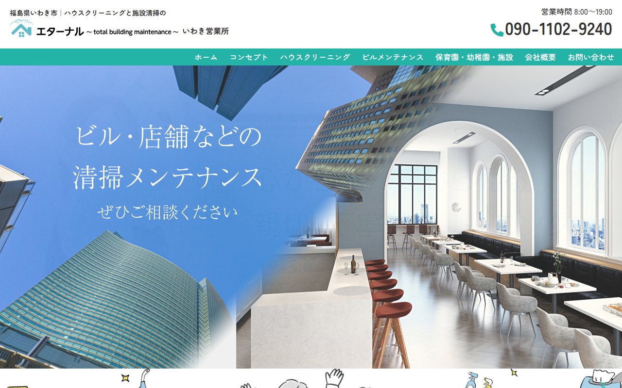 ハウスクリーニングと施設清掃のエターナル いわき営業所は、福島県いわき市平北白土を拠点とするハウスクリーニング・施設清掃業者です。エアコンクリーニング(家庭用標準型)は11,990円〜で、国家資格「ビルクリーニング技能士」を保有する専門スタッフが対応します。保育園・幼稚園・介護施設向けの専門メニューや高所作業資格を活かした大型施設清掃まで、いわき市内で他にはない幅広い対応力が特徴です。